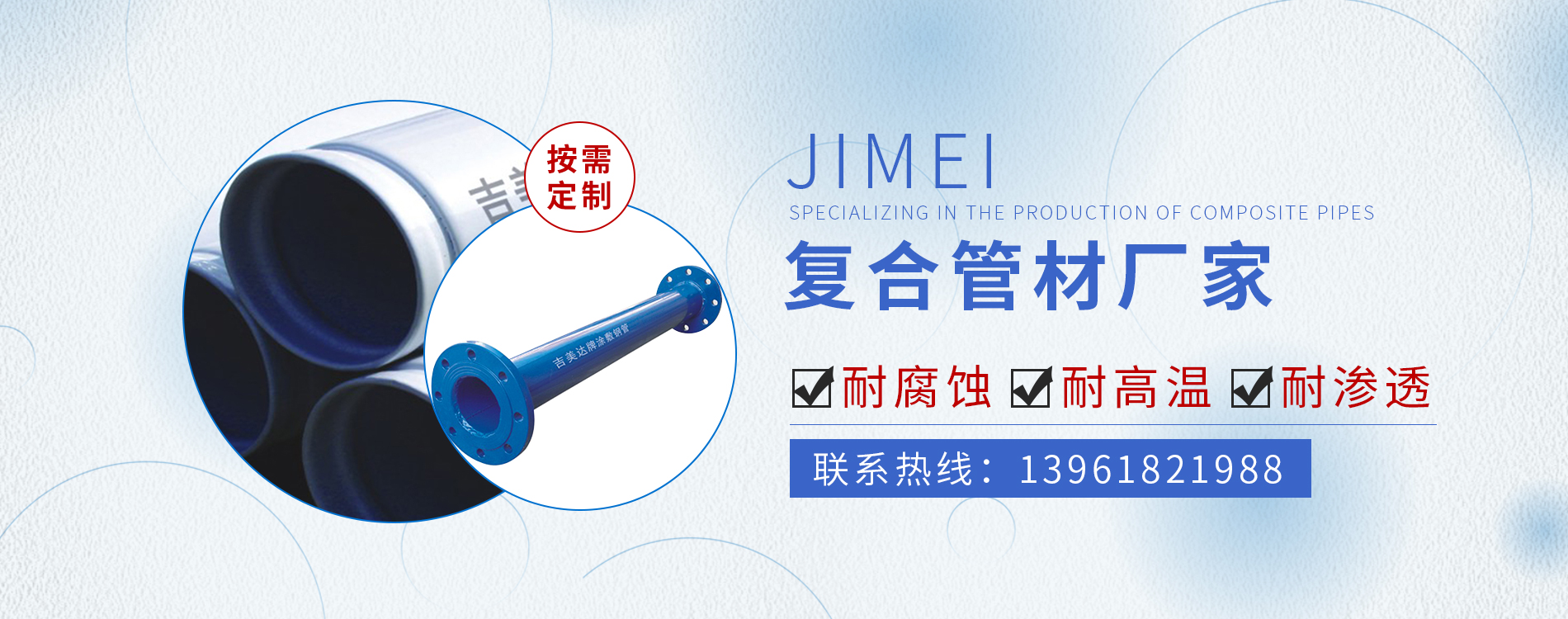 常州市吉美管業(yè)有限公司,是一家專(zhuān)業(yè)生產(chǎn)復(fù)合管材的生產(chǎn)企業(yè)。 依靠公司技術(shù)力量和多年的實(shí)踐經(jīng)驗(yàn),可年生產(chǎn)內(nèi)襯塑、內(nèi)襯外涂、內(nèi)外涂PE、PEX、EP復(fù)合管道以及工業(yè)防腐管道等多種復(fù)合管材及管件10萬(wàn)噸的生產(chǎn)能力。
